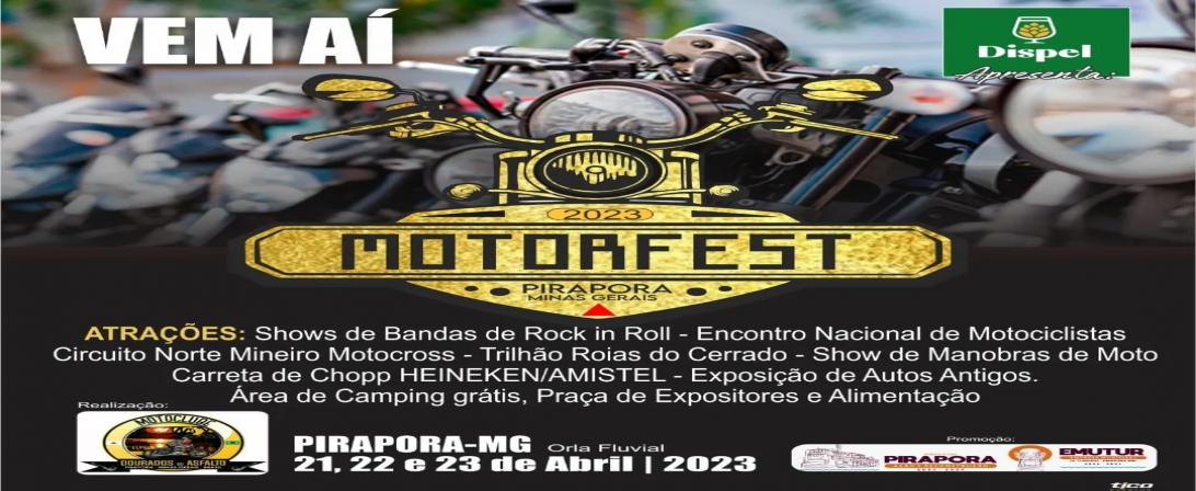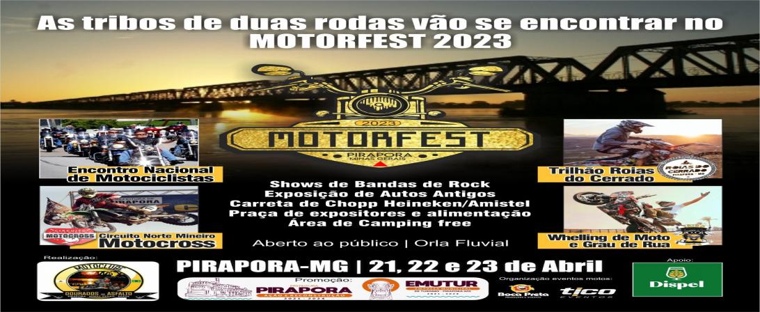 Começou a contagem regressiva para a ‘MotorFest’ 2023, a Festa dos Motociclistas que promete movimentar a orla fluvial de Pirapora durante o feriadão de Tiradentes, nos dias 21, 22 e 23. Realizado pela Motoclube ‘Dourados do Asfalto’, será o primeiro acontecimento (sobre duas rodas) do ano na cidade, contando com o apoio da Prefeitura/SEJUC e da EMUTUR.